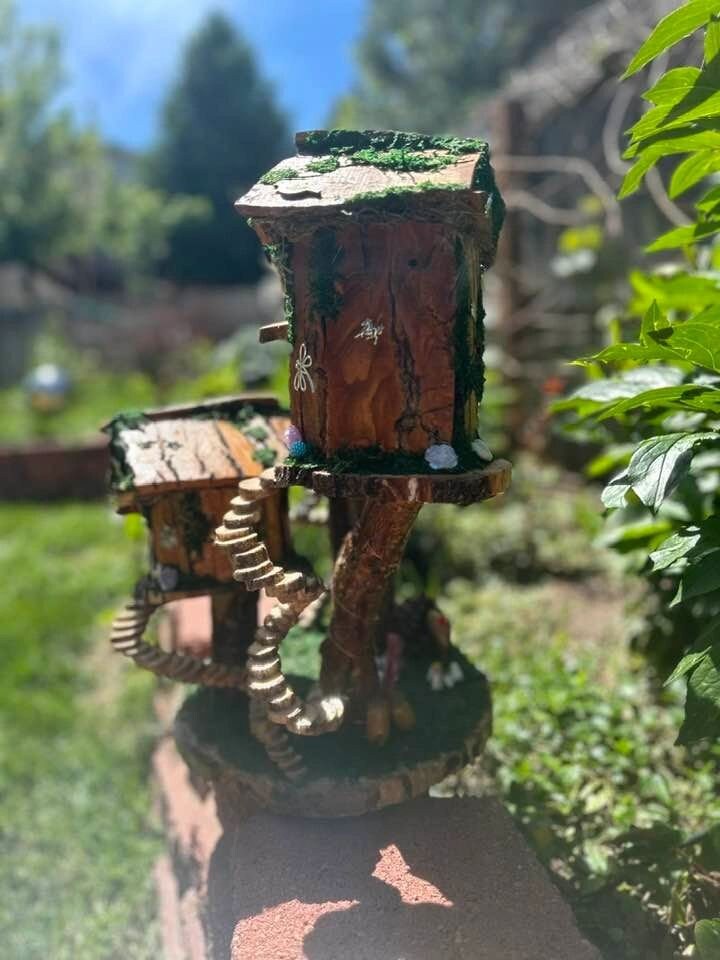 Triple Fairy House Adorable Fairy / Pixie House Fully Decorated With Lights Whimsical Large Fairy House Triple fairy house triples the fun. Beautiful addition to any covered area of your yard or porch. Great conversation piece for inside your home. Coated with triple thick glaze. #1 gift for little girls, they look at you with astonishment that you have treated them to something so mystical and magical that they love, FAIRIES! They jump up with glee each morning to see if their fairy friend visited the home in the night, they look for any sign of anything and swear they were there! Each fairy house that is made is unique and a one of a kind. Spiral staircases are breathtaking! Bonfire on the platform, with other attractions. Charms, glass, rocks and crystals on each home for accents! Adorable furniture sets in 2 of the homes! Comes with all decorations seen in photo. The exact weight and measurements are in the photos. Great for Gnomes too! Bring the fairy magic alive! This house sits in a 11 inch base.